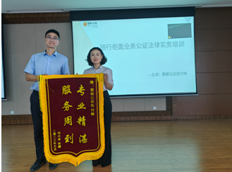 两个小时的培训结束后,银行方相关负责人现场赠送“专业精湛 服务周到”锦旗对我处表示感谢,并就委派银行人员来我处对公证人员开展相关银行业务培训达成初步意向。